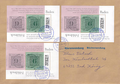 Inlandswarensendung (501-1 000 g) vom 19.04.2024 (11. Periode) frankiert mit 3 Blocks a 85 Cent (=2,55 €) |