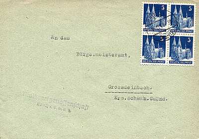 Inlandsbrief (1-20 g) vom 18.11.1948 (1. Periode) frankiert mit 4 Marken a 5 Pfennig (=20 Pfennig)