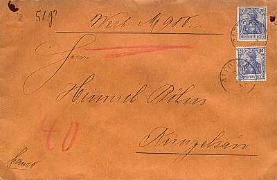 Auslandsbrief (1-20 g) vom 16.11.1905 frankiert mit 2 Marken a 10 Pfennig (=20 Pfennig) |