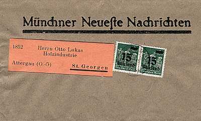 Foreign printed matter (26-50 g) from 10.09.1923 (17. Period) franked with 2 stamps a 15 000 Mark on 40 Mark (=30 000 Mark); to Austria the inland fee was valid |