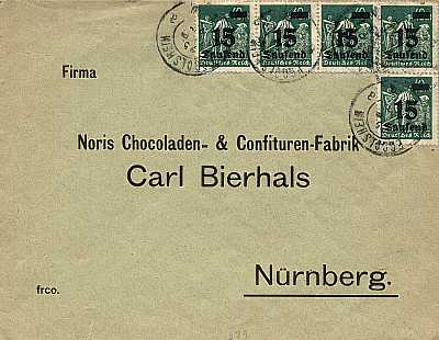 Inland cover (1-20 g) from 05.09.1923 (17. Period) franked with 5 stamps a 15 000 Mark on 40 Mark (=75 000 Mark) |