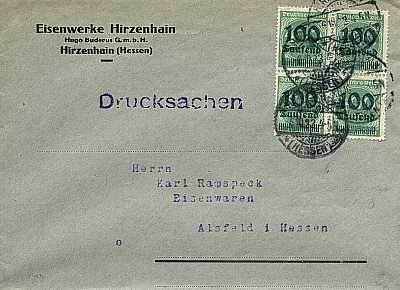 Inland printed matter (1-25 g) from 06.10.1923 (19. Period) franked with 4 stamps a 100 000 Mark on 400 Mark (=400 000 Mark) |
