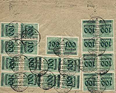 Foreign printed matter (51-100 g) from 06.10.1923 (19. Period) franked with 12 stamps a 100 000 Mark on 400 Mark (=1,2 Million Mark); to Austria the inland fee was valid |
