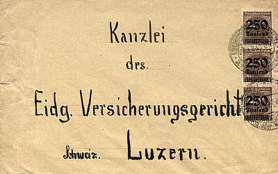 Foreign cover (1-20 g) from 25.09.1923 (18. Period) franked with 3 stamps a 250 000 Mark on 400 Mark (=750 000 Mark)