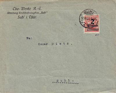 Local cover (1-20 g) from 17.10.1923 (20. Period) franked with one stamp a 2 Million Mark on 500 Mark (=2 Million Mark)