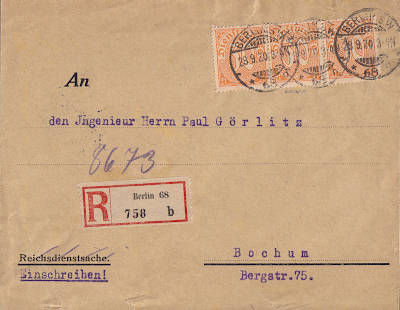 Inland cover with registeration (1-20 g) from 28.09.1920 (5. Period) franked with 3 stamps a 30 Pfennig (=90 Pfennig, 40 cover
