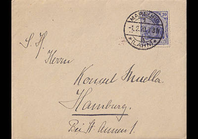 Inland cover (1-20 g) from 01.02.1920 (4. Period) franked with one stamp a 20 Pfennig (=20 Pfennig)