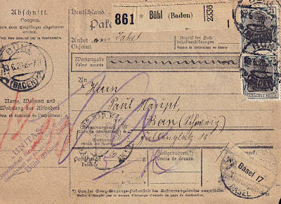 Foreign parcel card (5 000 g) from 10.06.1920 (5. Period) franked with 16 stamps a 75 Pfennig (=12 Mark) |