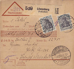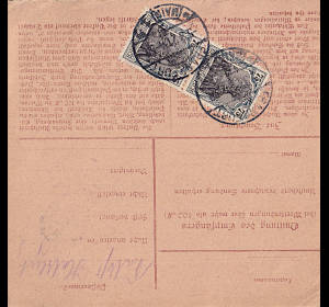 Inland parcel card with cash on delivery (5 000 g, > 75 km) from 26.11.1919 (4. Period) franked with 2 stamps a 75 Pfennig (=1,50 Mark, 1,25 parcel 0,25 cash on delivery) |