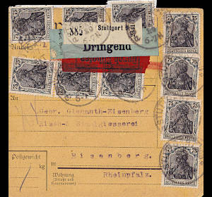 Inland parcel card with urgend transport (1 000 g, > 75 km) from 27.10.1920 (5. Period) franked with 10 stamps a 75 Pfennig (=7,50 Mark, 6 parcel 1,50 special delivery) |