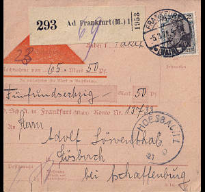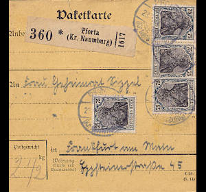 Inland parcel card (5 000 g, > 75 km) from 19.05.1919 (3. Period) franked with one stamp a 75 Pfennig (=75 Pfennig) |