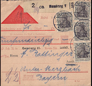 Inland parcel card with cash on delivery (2 500 g, > 75 km) from 30.08.1920 (5. Period) franked with 4 stamps a 75 Pfennig (=3 Mark, 2 parcel 1 cash on delivery) |