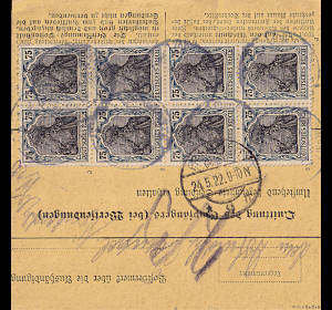 Inland parcel card (2 500 g, > 75 km) from 23.05.1922 (7. Period) franked with 12 stamps a 75 Pfennig (=9 Mark) |