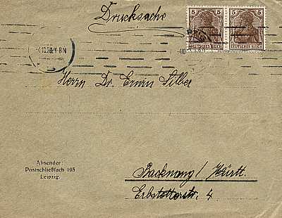 Inland printed matter (1-50 g) from 04.10.1920 (5. Period) franked with 2 stamps a 5 Pfennig (=10 Pfennig)