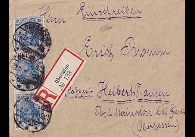 Local cover with registeration (1-20 g) from 17.02.1920 (5. Period) franked with 3 stamps a 30 Pfennig (=90 Pfennig, 40 cover 50 registeration) |