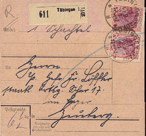 Inland parcel card (6 500 g, < 75 km) from 21.02.1921 (5. Period) franked with two stamps a 1¼ Mark (=2,50 Mark) |