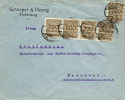Inland cover (1-20 g) from 07.11.1923 (23. Period) franked with 5 stamps a 200 Million Mark (=1 Billion Mark) |