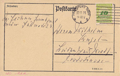 Inland postcard from 30.11.1923 (26. Period) franked with one stamp a 10 Billion Mark (=40 Billion Mark) |
