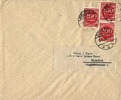 Ortsbrief (1-20 g) vom 22.08.1923 (15. Periode) frankiert mit 2 Marken a 200 Mark (=400 Mark) |