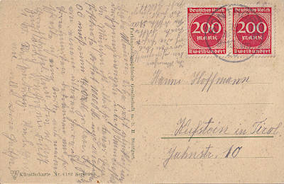 Auslandspostkarte vom 18.08.1923 (15. Periode) frankiert mit 2 Marken a 200 Mark (=400 Mark); nach Österreich galt der Inlandstarif |