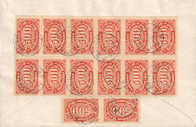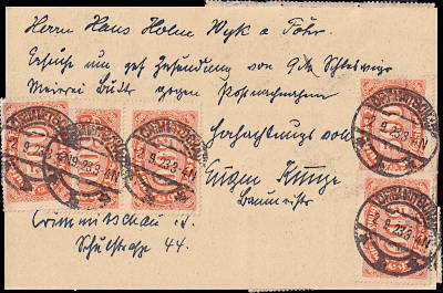 Auslandsbrief (1-20 g) vom 17.08.1923 (15. Periode) frankiert mit 6 Marken a 500 Mark (=3 000 Mark) |