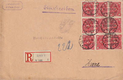 Inland cover with registeration (1-20 g) from 16.11.1922 (10. Period) franked with 2 stamps a 10 Mark (=20 Mark, 12 cover 8 registeration) |