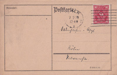 Inland postcard from 13.03.1923 (13. Period) franked with 4 stamps a 10 Mark (=40 Mark) |