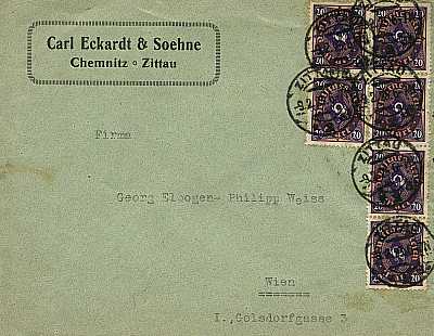 Foreign cover (1-20 g) from 10.01.1923 (11. Period) franked with 4 stamps a 20 Mark (=80 Mark) |