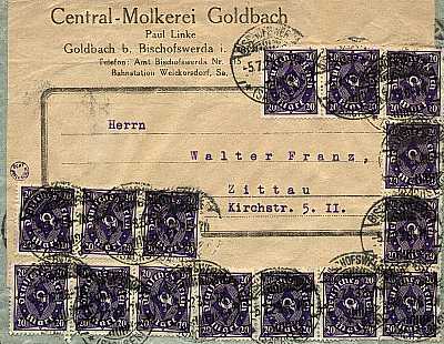 Inlandsbrief (1-20 g) vom 05.07.1923 (14. Periode) frankiert mit 15 Marken a 20 Mark (=300 Mark) |