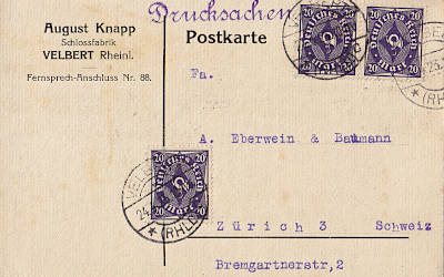 Ortspostkarte vom 26.03.1923 (13. Periode) frankiert mit einer Marke a 20 Mark (=20 Mark) |