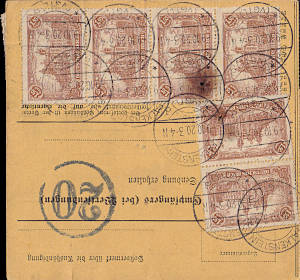 Auslandspaketkarte (4 000 g) vom 05.05.1920 (4. Periode) frankiert mit 8 Marken a 1,50 Mark (=12 Mark) |