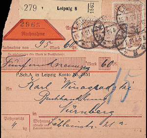 Inlandspaketkarte mit Nachnahme (4 000 g, > 75 km) vom 15.01.1921 (5. Periode) frankiert mit 2 Marken a 1,50 Mark (=3 Mark, 2 Paket 1 Nachnahme) |