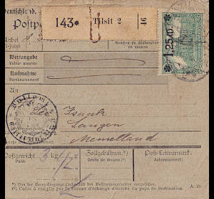 Foreign parcel card (3 500 g, < 75 km) from 31.12.1920 (5. Period) franked with one stamp a 1,25 Mark on 1 Mark (=1,25 Mark); to Memel the inland fee was valid |