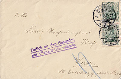 Foreign cover (1-20 g) from 06.07.1916 franked with 2 stamps a 5 Pfennig (=10 Pfennig)