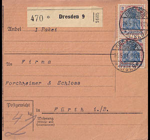Inlandspaketkarte (4 000 g, > 75 km) vom 14.05.1921 frankiert mit 2 Marken a 2 Mark (=4 Mark) |