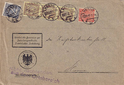 Ortsbrief mit Zustellungsurkunde (21-100 g) vom 23.11.1922 frankiert mit 5 Marken (=18 Mark, 8 Brief 6 Zustellung 4 Urkunde)