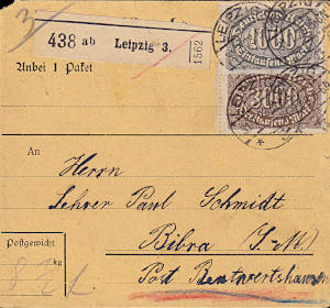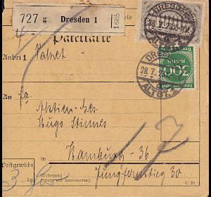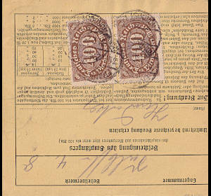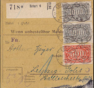 Inland parcel card (3 000 g, >75 km) from 28.07.1923 franked with 3 stamps (=1 600 Mark) |