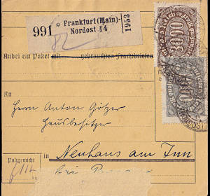 Inland parcel card (5 500 g, 75-375 km) from 02.07.1923 franked with 9 stamps (=2 800 Mark) |
