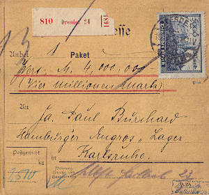 Inland parcel card with value (4 Million Mark) (2 510 g, > 75 km) from 19.07.1923 franked with 12 stamps (=41 900 Mark, 1 600 parcel 300 registeration 40 000 value)