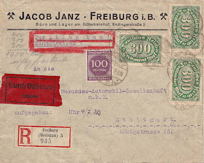 Inland cover with registeration and special delivery (1-20 g) from 04.07.1923 franked with 4 stamps (=1 000 Mark, 300 cover 300 registeration 400 special delivery) |