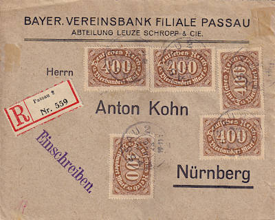 Inlandsbrief mit Einschreiben (1-20 g) vom 23.08.1923 frankiert mit 5 Marken a 400 Mark (=2 000 Mark, 1 000 Brief 1 000 Einschreiben) |