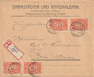 Inlandsbrief mit Einschreiben (1-20 g) vom 18.08.1923 frankiert mit 4 Marken a 500 Mark (=2 000 Mark, 1 000 Brief 1 000 Einschreiben) |