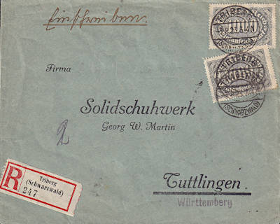 Inlandsbrief mit Einschreiben (1-20 g) vom 23.08.1923 frankiert mit 2 Marken a 1 000 Mark (=2 000 Mark, 1 000 Brief 1 000 Einschreiben) |