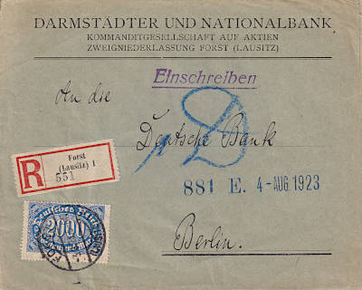 Inlandsbrief mit Einschreiben (1-20 g) vom 03.08.1923 frankiert mit einer Marke a 2 000 Mark (=2 000 Mark, 1 000 Brief 1 000 Einschreiben) |