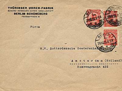 Auslandsbrief (1-20 g) vom 29.10.1923 frankiert mit 3 Marken a 10 Millionen Mark (=30 Millionen Mark) |