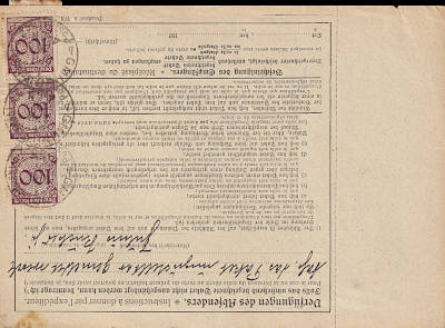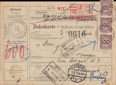Foreign parcel card with value (624 Mark) (5 900 g) from 01.04.1926 franked with 6 stamps a 100 Pfennig (=6 Mark)