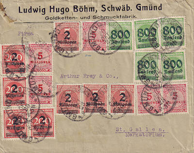 Auslandsbrief (21-40 g) vom 20.10.1923 (21. Periode) frankiert mit 18 Marken (=45 Millionen Mark) |