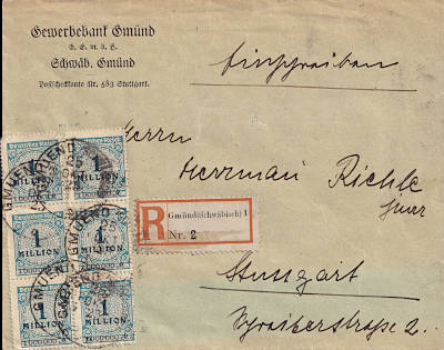 Inlandsbrief mit Einschreiben (1-20 g) vom 25.10.1923 (21. Periode) frankiert mit 20 Marken a 1 Million Mark (=20 Millionen Mark, 10 Millionen Brief 10 Millionen Einschreiben) |