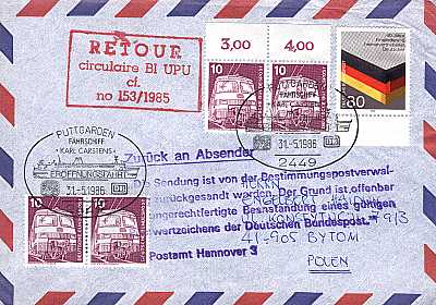 Brief nach Polen mit rotem "Retour"-Stempel der polnischen Post und blauem sechszeiligen "Zurück"-Stempel der westdeutschen Post |