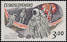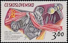 Wladimir Komarow und sowjet-ische Flagge; Besatzung von Soyuz 11: Georgi Dobrovolski, Vladislav Volkov und Viktor Pacaev